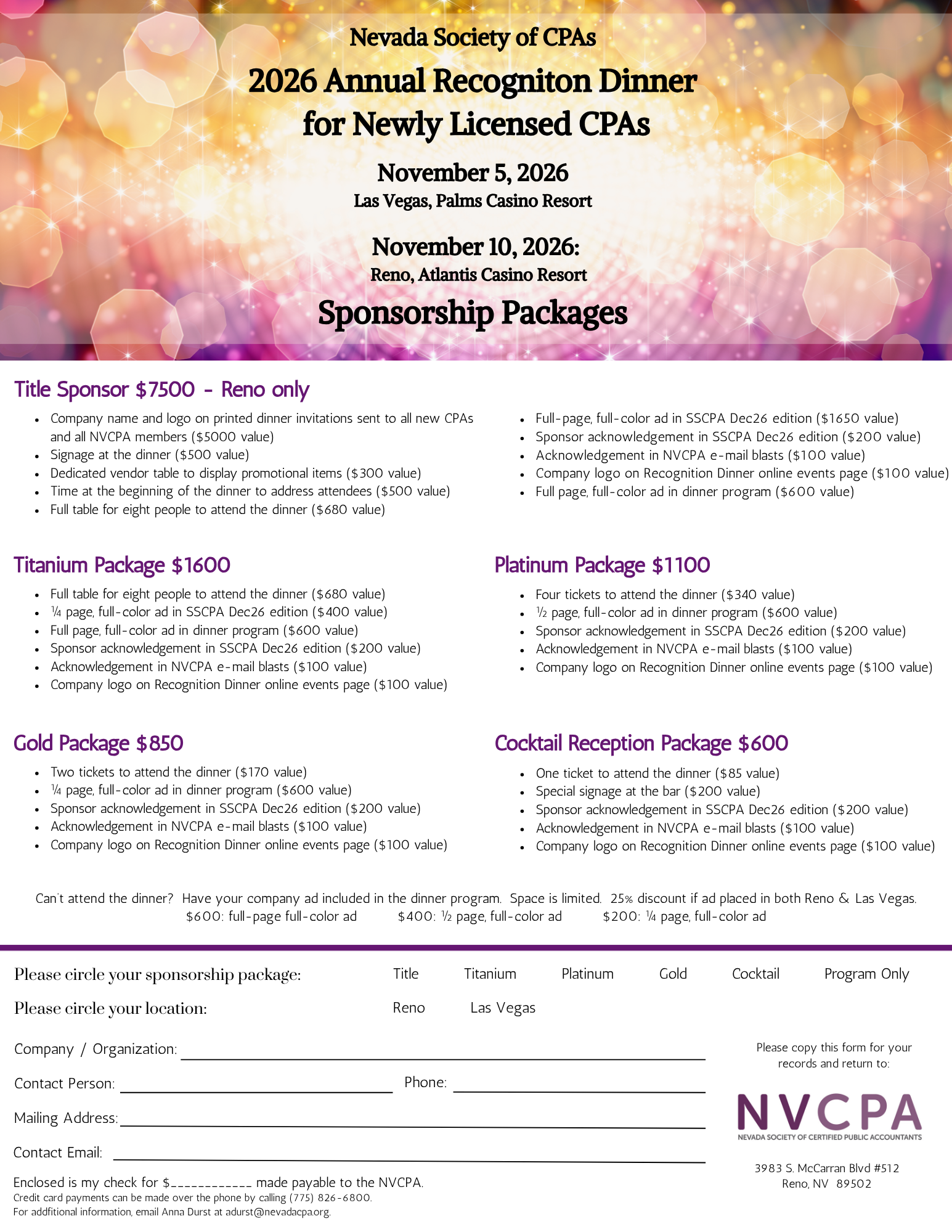 The NVCPA offers multiple opportunities to advertise & sponsor within the organization. From the Silver State CPA (society magazine) to our annual events, we have a spot for your organization. All current opportunities are listed below.